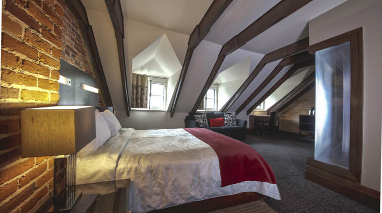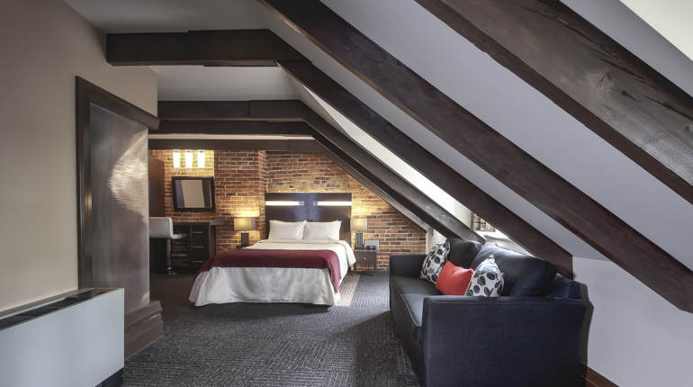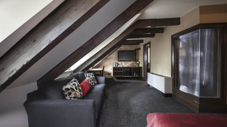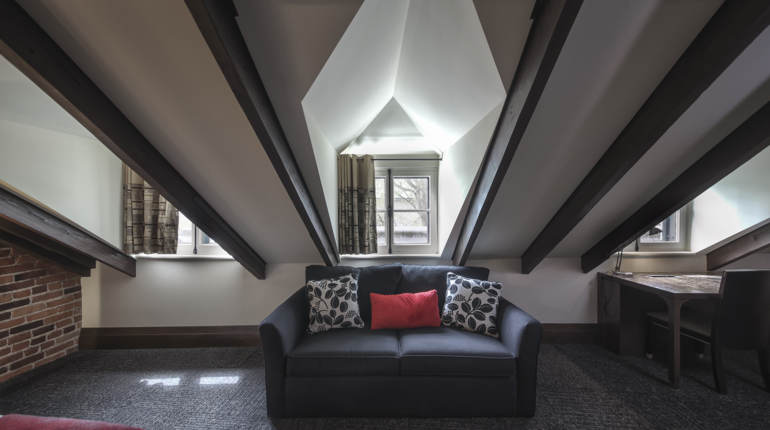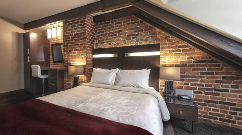 Dans un style associant le charme européen et le confort moderne, cette chambre spacieuse comblera tous vos désirs. Laissez-vous envoûter par le mur de pierres et la vue sur la rue Sainte-Anne, tout en profitant d'un lit moelleux, d'une grande baignoire et d'un écran de 42 pouces.